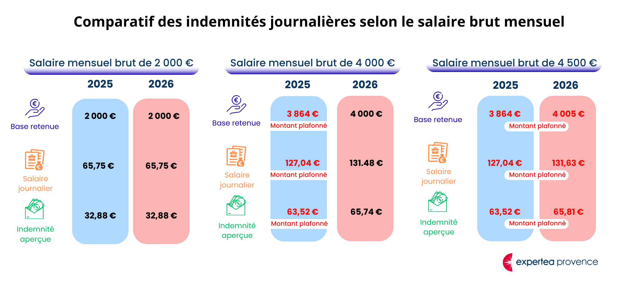 En règle générale, cette hausse du plafond n’aura pas d’impact pour les salariés dont le salaire mensuel brut est inférieur à 3 864 €, car leurs cotisations et indemnités sont déjà calculées sur leur salaire réel, en dessous du plafond.
