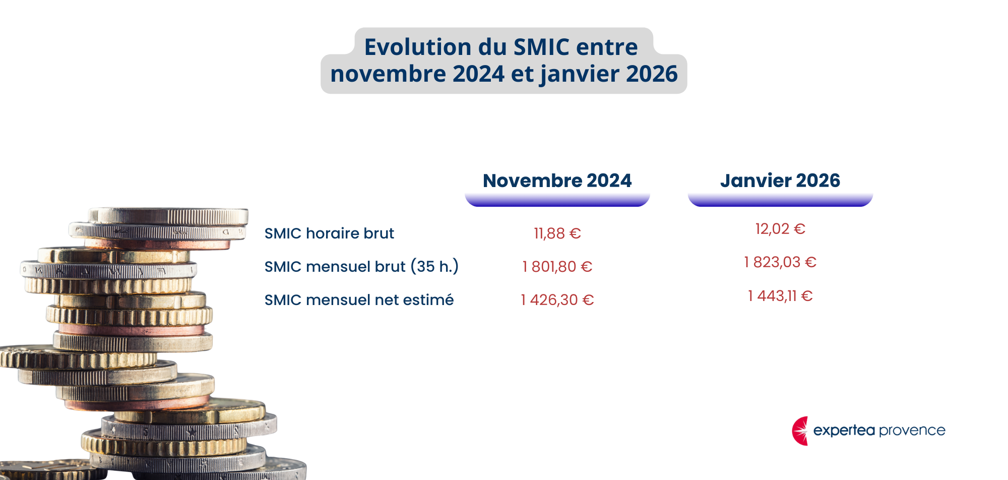 • le SMIC horaire brut passe à 12,02 € (contre 11,88 € en 2025) ;